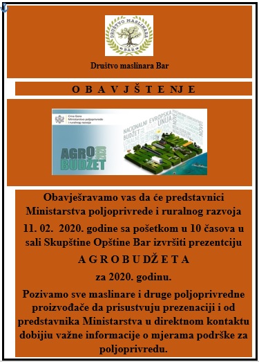 Obavještavamo vas da će predstavnici Ministarstva poljoprivrede i ruralnog razvoja 11. 02. 2020. godine sa početkom u 10 časova u Baru, u sali Skupštine Opštine Bar izvrštiti prezentaciju AGROBUDŽETA za 2020. godinu.