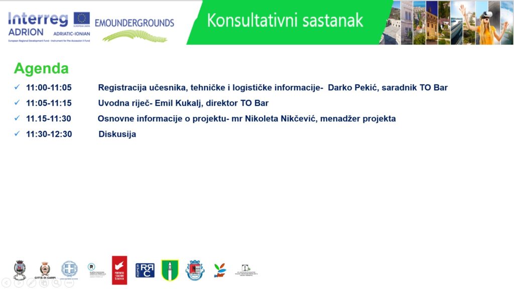 Danas je Turistička organizacija Bar organizovala prvi online konsultativni sastanak na projektu „EMOUNDERGROUNDS“ sa ciljem upoznavanja zainteresovane javnosti sa predstojećim aktivnostima, ali i dobijanja relevantnih predloga za unapređenje i bolju valorizaciju kulturnih dobara na teritoriji opštine Bar.