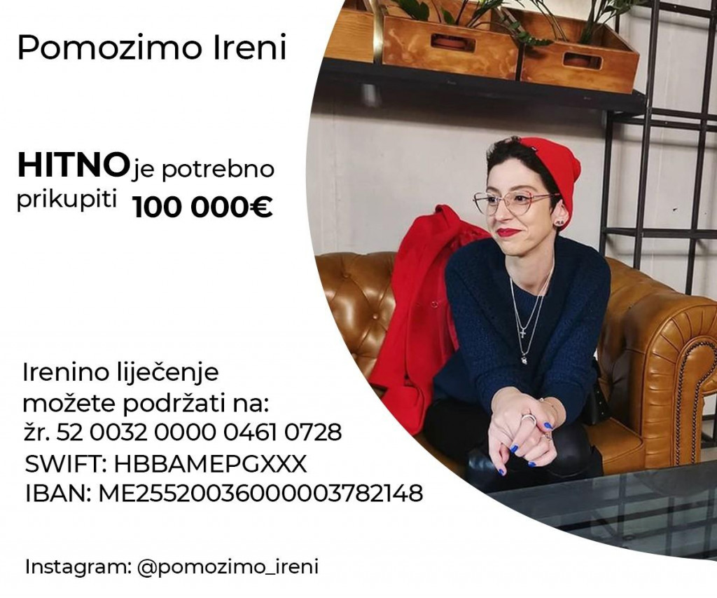 Porodica Crnčević iz Bara pozvala je sve građane i društveno odgovorne kompanije da pomognu iječenje Irene Crnčević, rođene 1991.godine, koja se od januara 2019. godine bori sa rijetkim karcinomom.