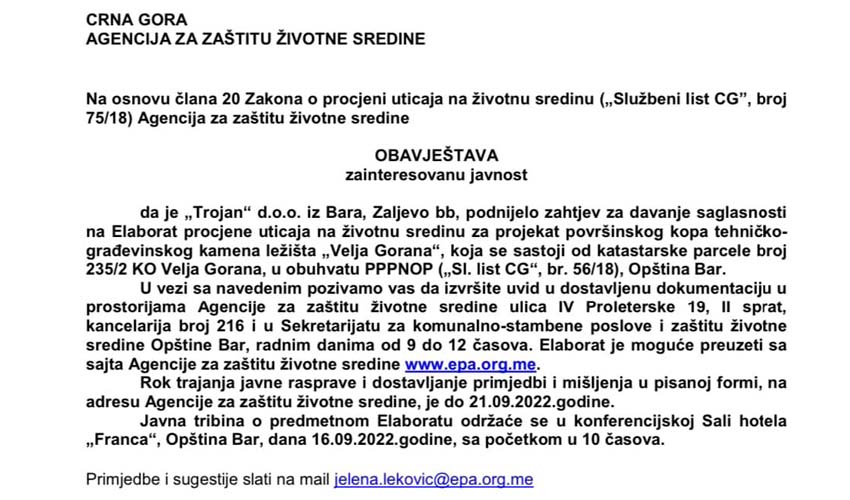 Sjutra (16.09.2022.) u 10:00h u Hotelu Franca u Baru, biće održana javna tribina povodom Elaborata o procjeni uticaja kamenoloma Velja Gorana na životnu sredinu.