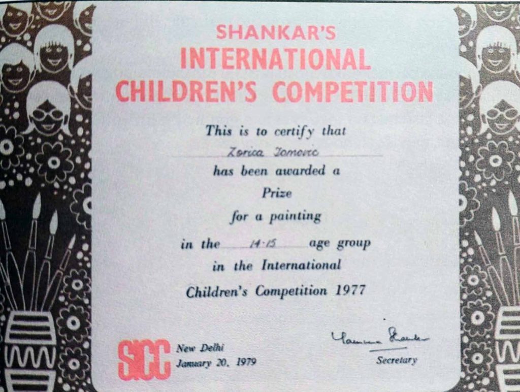 I onda, slučajno, u tadašnjem Titogradu sretnem jednog kolegu koji priča da konkuriše negdje u Indiji na nekoj svjetskoj izložbi, Shankar’s Competititon, i daje mi adresu, kaže: „Pošalji te đačke radove, ako možeš.“