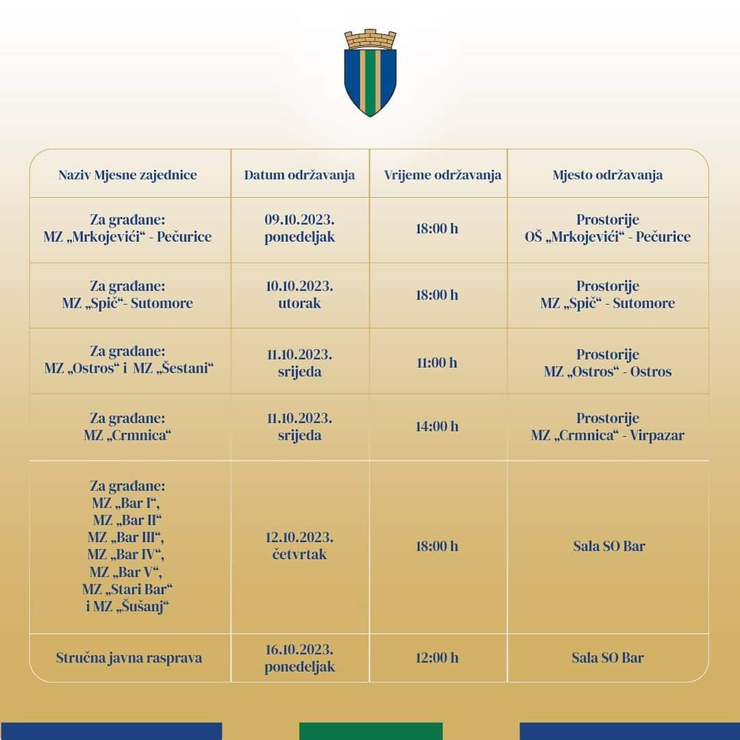 Opština Bar: U ponedeljak 09. oktobra u 18.00h javna rasprava u prostorijama OŠ “Mrkojevići”