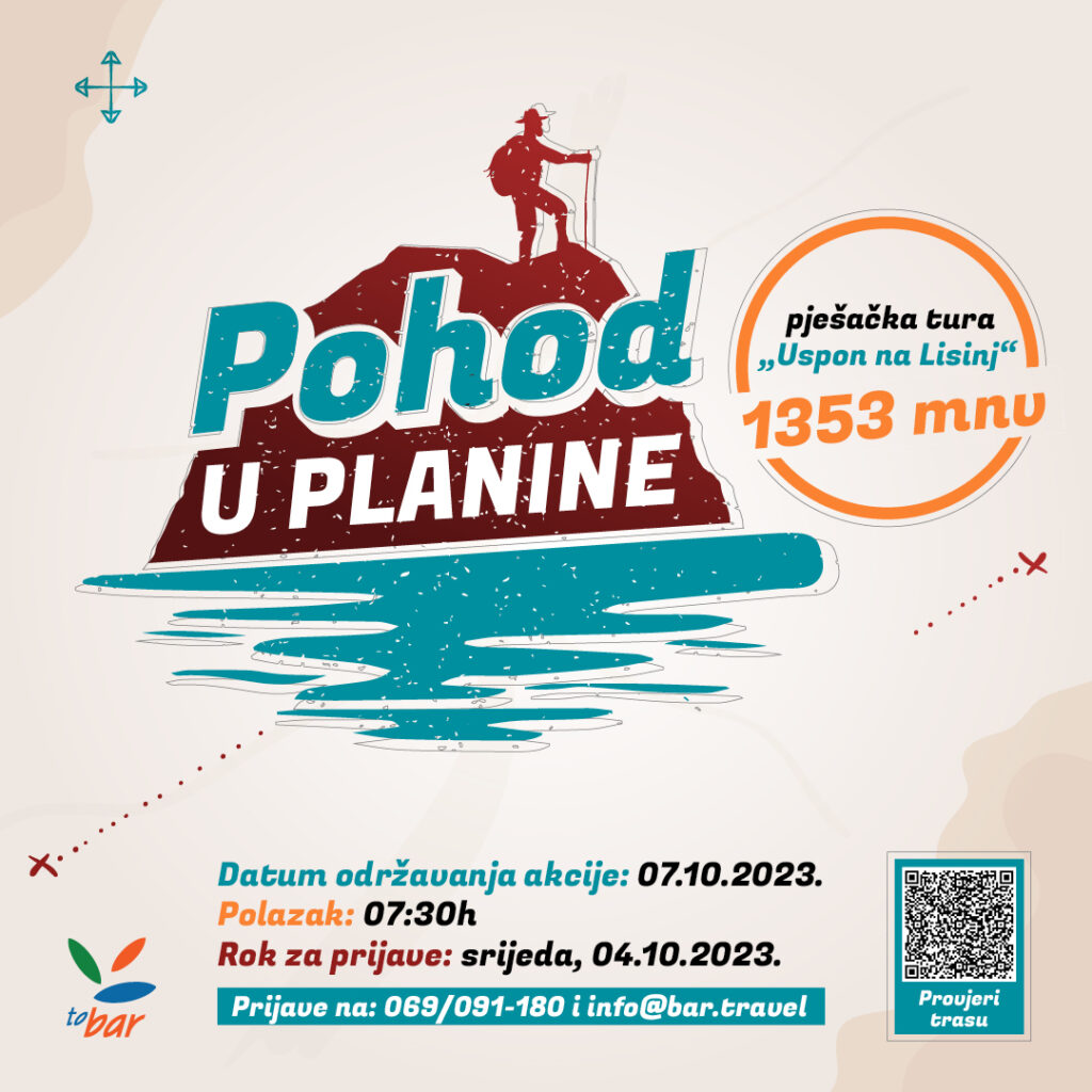 Turistička organizacija Bar tradicionalno organizuje akciju ,,Pohod u planine”, koja ima za cilj popularizaciju aktivnog odmora u zaleđu našeg grada. Akcija se održava u subotu, 07. oktobra 2023., a ove godine promovisaće pješačku turu „Uspon na Lisinj (1353 mnv)“.