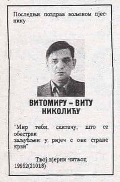 Jedan anonimni, potpisan kao vjerni čitalac, ovako se od Vita Nikolića opraštao: njegovim stihom, u Pobjedinoj čitulji. ,,Mir tebi, skitaču, što se obestrvi zaljubljen u riječ s one strane krvi“.