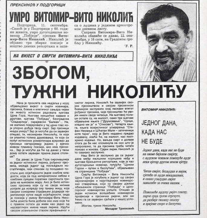 Tekst Miodraga Tripkovića nakon vijesti o smrti Vitomira Nikolića, foto: Arhiva Pobjede