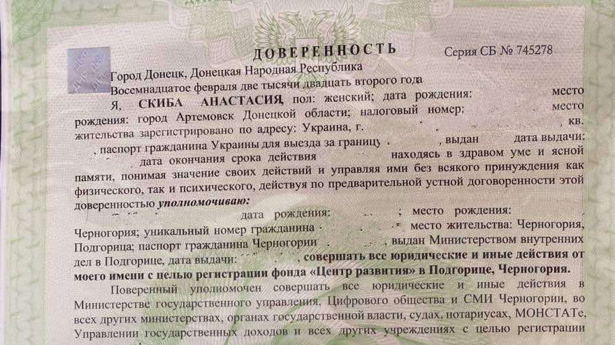„Centar za razvoj“ registrovan je kod crnogorskog Ministarstva javne uprave, a među podnijetim dokumentima nalazila se i punomoć sa pečatom notara Donjecke Narodne Republike (DNR), proruske separatističke oblasti koju Crna Gora ne priznaje. Rusija je 2022. godine proglasila aneksiju Donjecke oblasti.