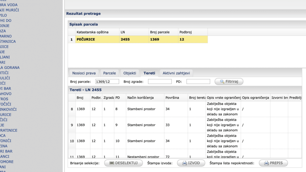 Izvještaj Uprave za nekretnine o objektima u Pečuricama bez građevinske dozvole. Foto: Uprava za nekretnine Crne Gore
