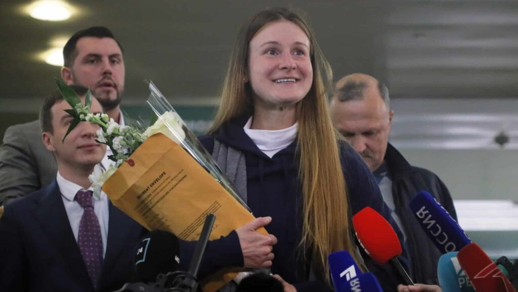 Maria Butina na aerodromu u Moskvi nakon deportovanja iz SAD. Foto: EPA-EFE/SERGEI ILNITSKY